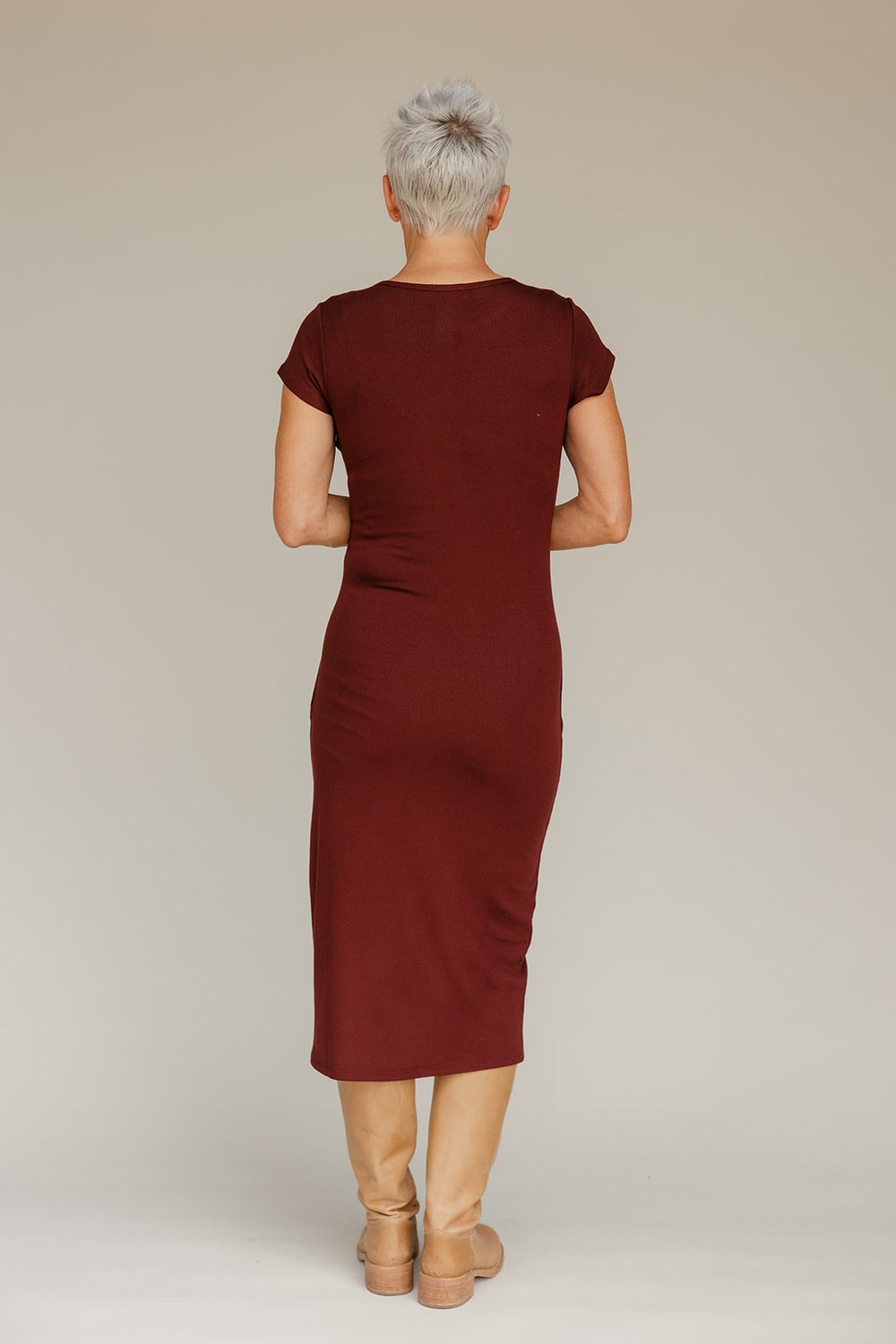 Sophisticated and sleek. This wine-colored knit dress hugs in all the right places, featuring a fitted silhouette, cap sleeves, and timeless midi length — perfect for any occasion.