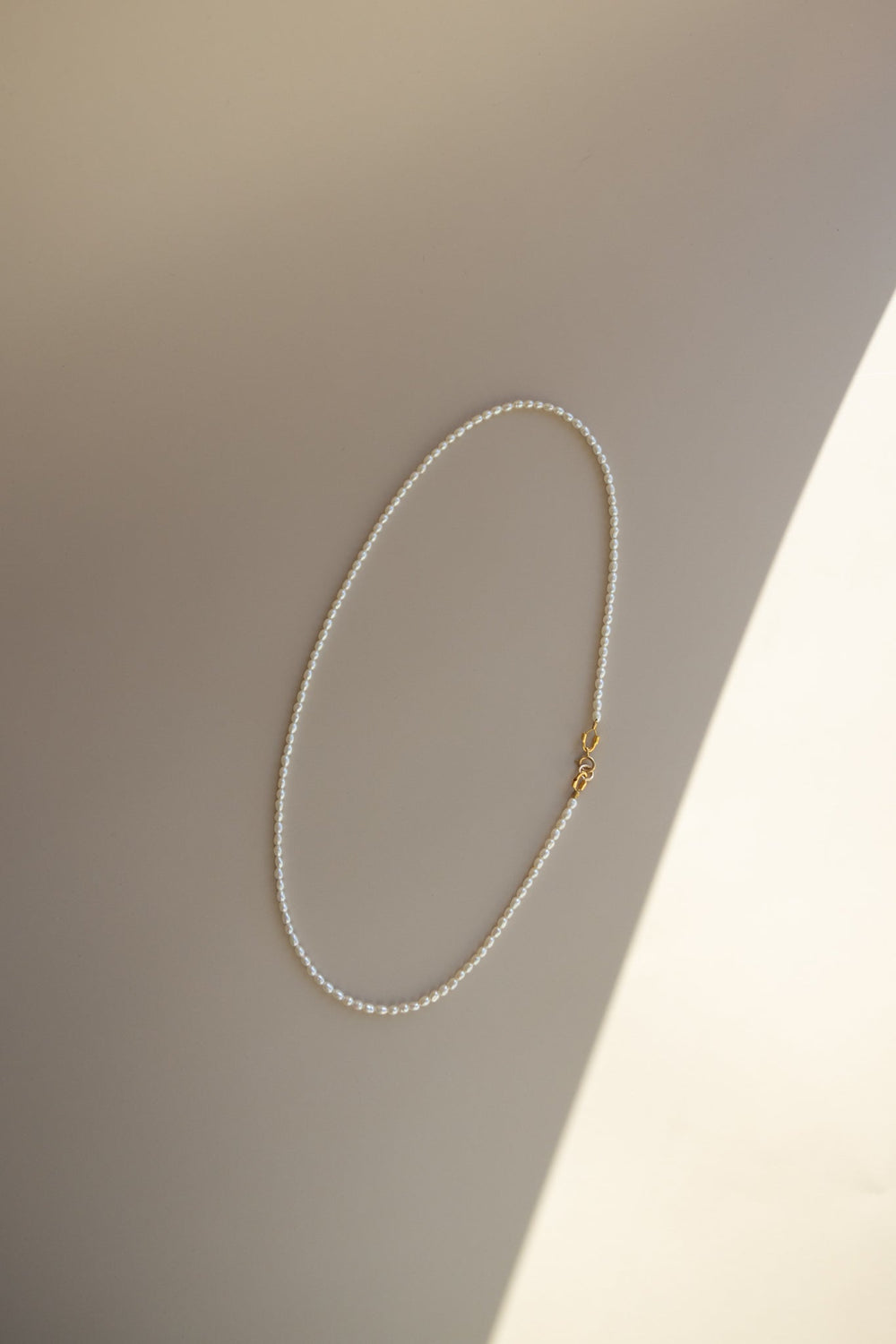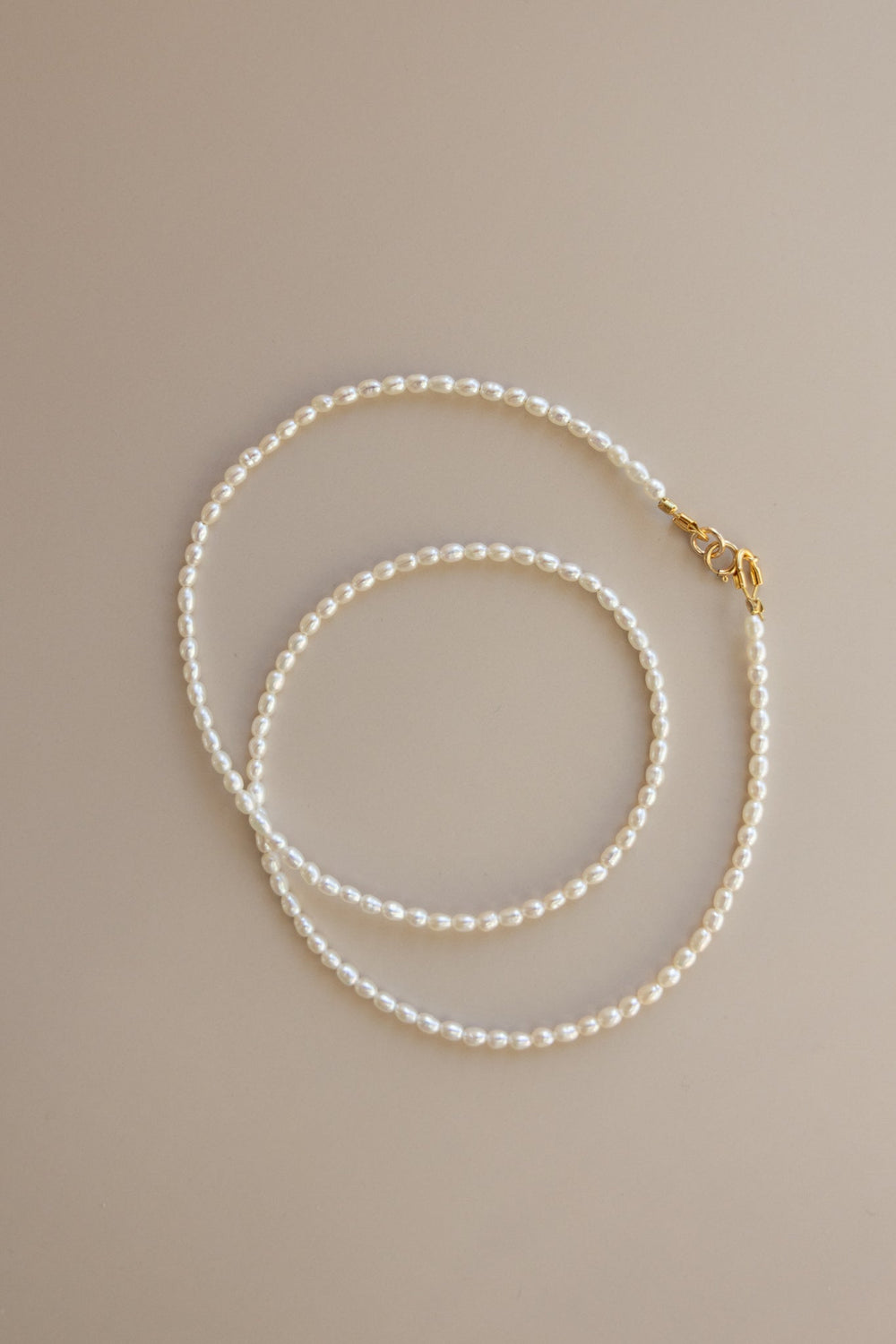 Handcrafted from 2.5mm rice pearls and 5mm gold plated spring ring closure .
