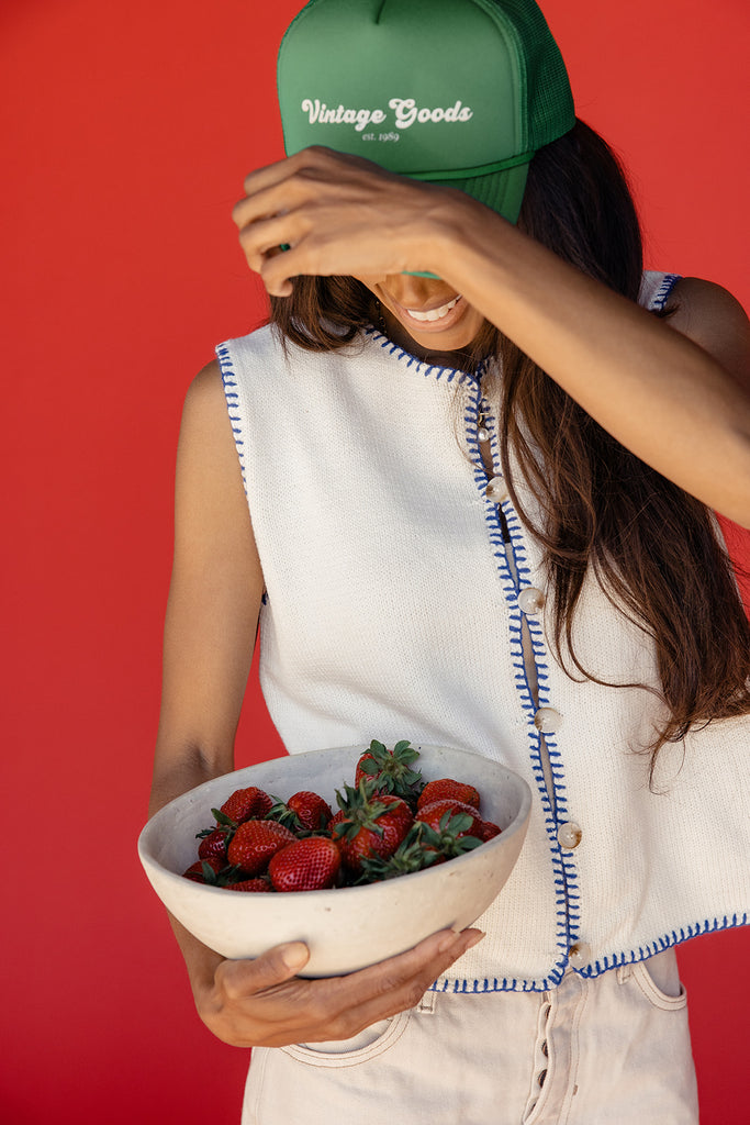 This stunning vest features functional buttons, blue stitching details, and the perfect fit. You can wear the United Button Vest for all your summer adventures this year, perfect for BBQs, the 4th of July, and summer date nights.