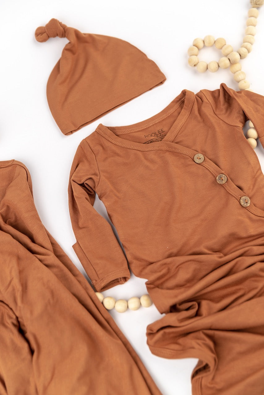 This baby bundle includes a newborn gown with working buttons, a swaddle, and a cute little hat. The perfect set to add to your hospital bag! This bundle comes in three gorgeous shades to fit any aesthetic. The gown included features a bottom you can knot to keep their tiny legs covered + fold-over cuffs to keep baby from scratching themselves.Β The gown and hatΒ make the perfect combination for those newborn pictures you're dying to snap. So simple + comfy!