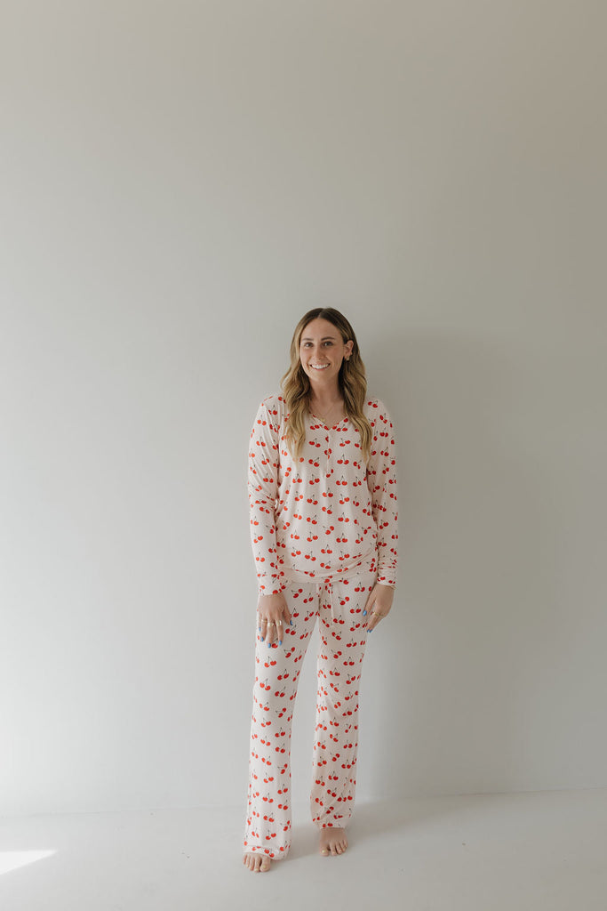 Everyone's favorite bamboo women's pajamas, featuring a long-sleeve top with three buttons and a slight flared pant. Be sure to look at our matching baby and toddler pajamas in this charming print! *These pajamas feature snaps down the front for easy accessibility for breastfeeding moms and elastic waistbands ensure max comfortability*
