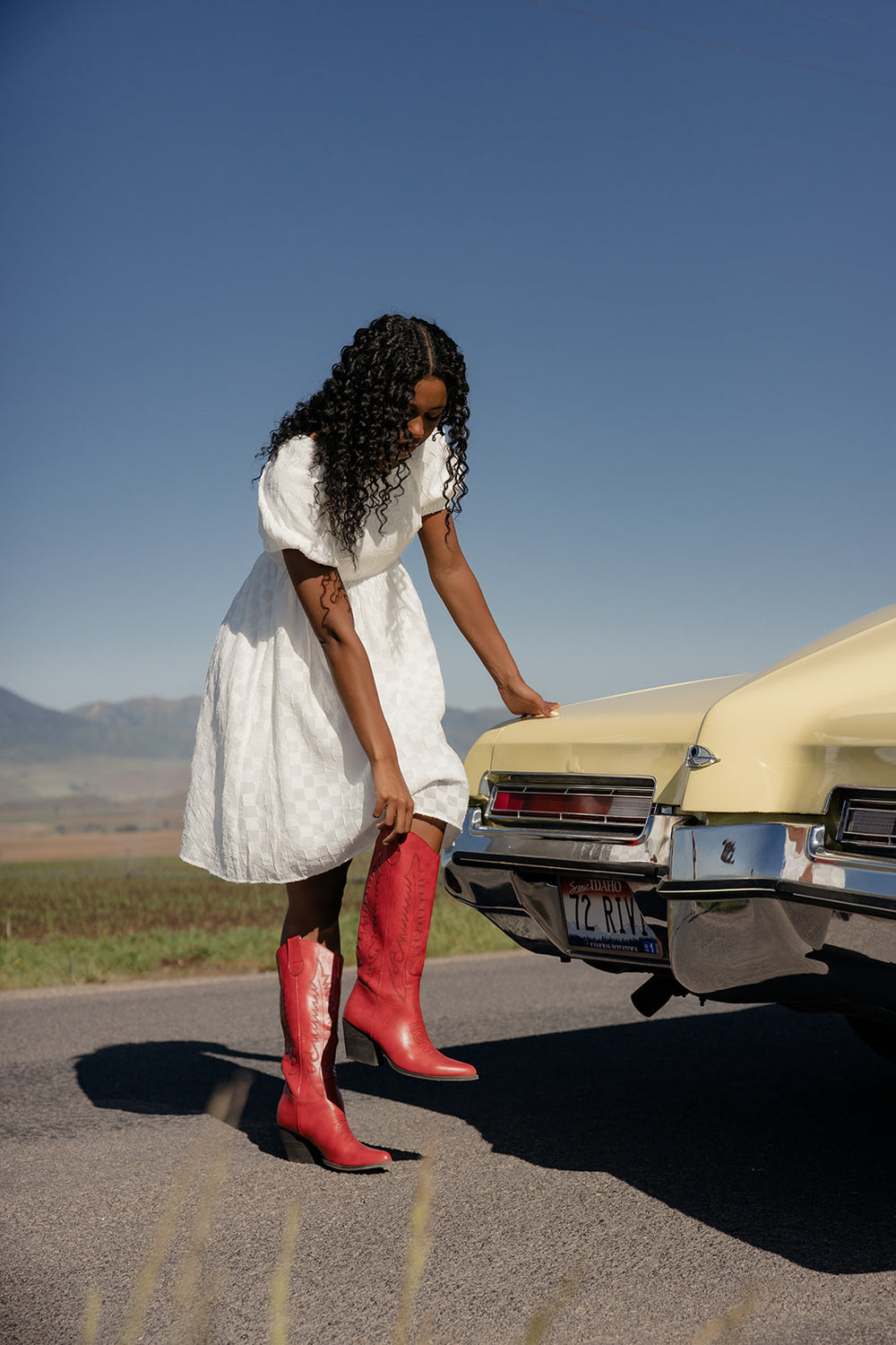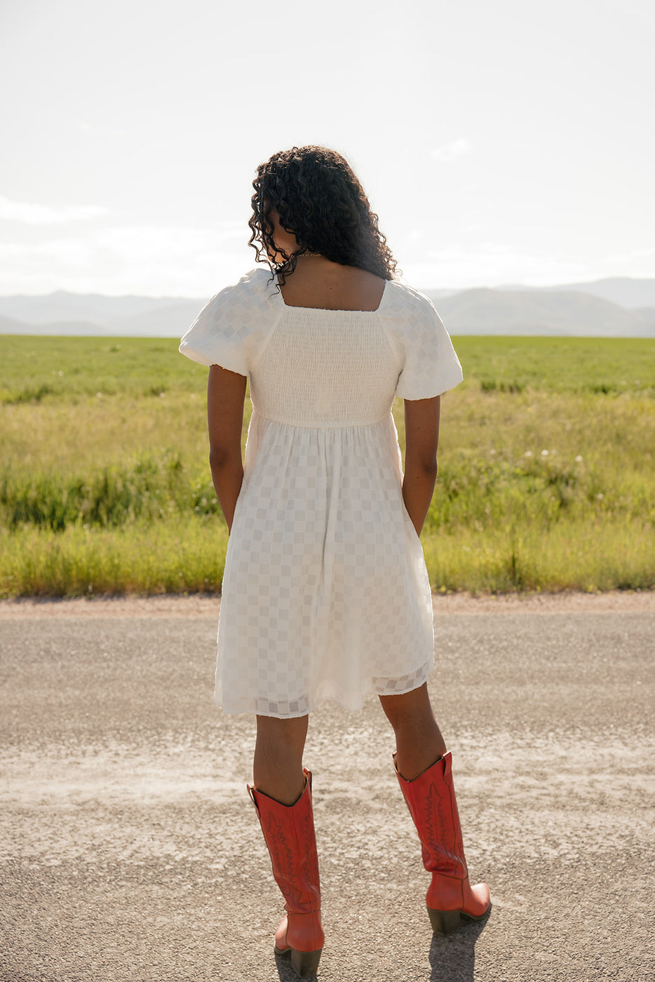 This simple white dress has a secret- a subtle checkerboard print! How fun is the Wonderwall Checkered Dress? Perfect for Sunday Service, a date night, or a day at the office!